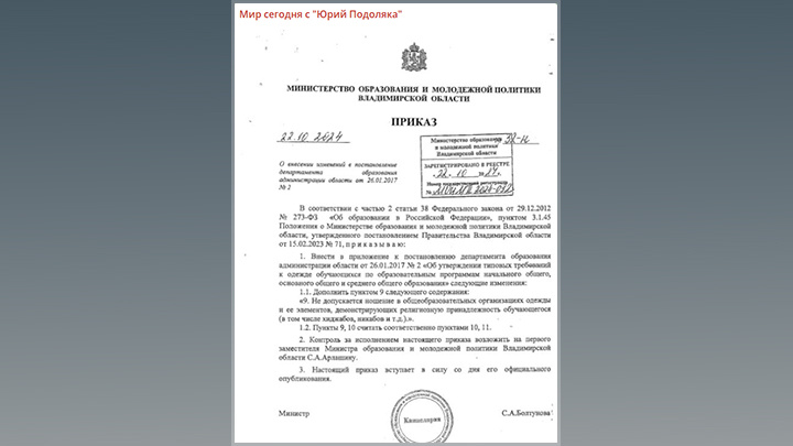 Приказ Министерства образования и молодёжной политики Владимирской области гласит, что «не допускается ношение в общеобразовательных организациях одежды и её элементов, демонстрирующих религиозную принадлежность обучающихся».